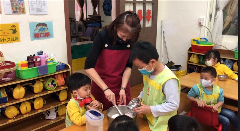 忠山幼兒園在生活情境中學客語,圖為搭配節慶過年主題,蒸發糕。圖/新北教育局提供