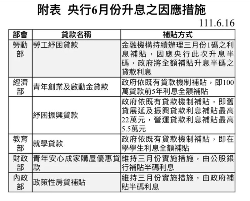 紓困振興貸款方面,政院表示,經濟部主管之此項貸款,包括:舊有貸款展延、營運資金貸款、振興資金貸款,係依郵政定儲機動利率提供補貼,故會配合央行升息,調整補貼金額,惟每家公司仍有補貼額度上限(舊貸展延及振興貸款最高22萬元、營運資金貸款最高5.5萬元)。