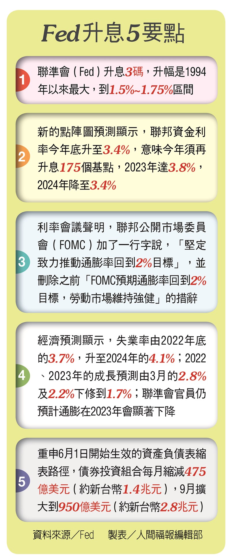 【本報綜合外電報導】美國聯邦準備理事會(Fed)於台灣時間16日凌晨2時宣布調高利率3碼,基準利率升至1.5~1.75%,調升幅度為1994年來最大,利率水準也高於2020年3月新冠疫情爆發前。聯準會主席鮑爾在會後記者會上說,7月下次利率決策會議可能再升3碼,充分展現與通膨對抗到底的決心。