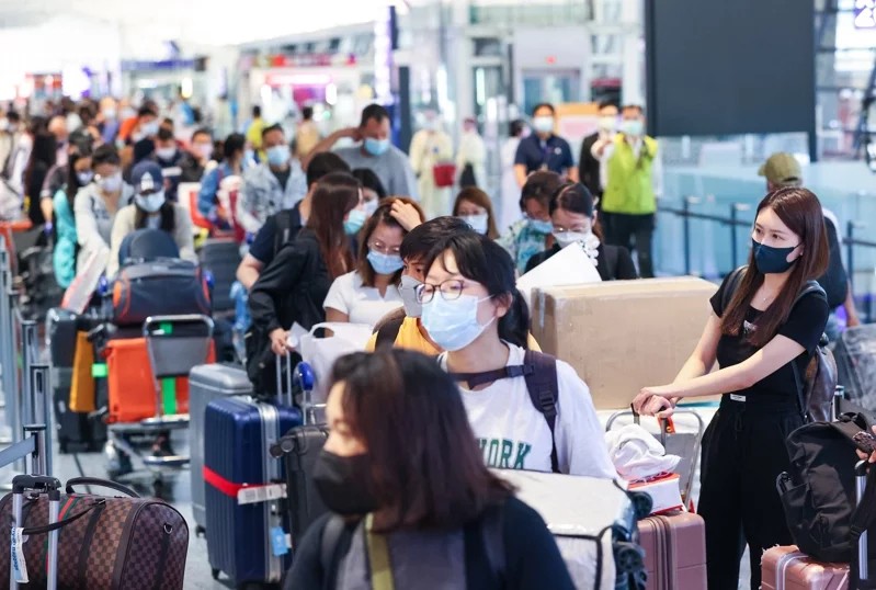入境限額 旅客飽和 因應3+4入境檢疫新制,每周限額2.5萬人次,遭詬病沒有放寬,旅客已飽和。圖為入境旅客等待唾液PCR採檢。圖/黃仲明