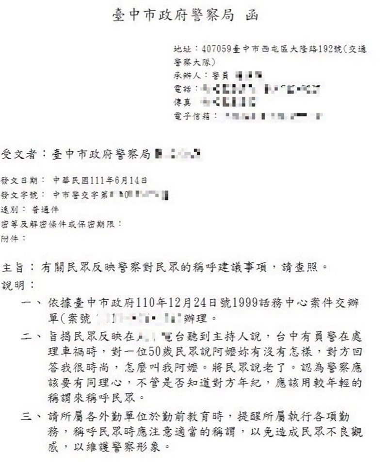 公文指出,市警局請外勤單位提醒員警執行勤務時,稱呼民眾應注意適當稱謂,以免造成民眾不良觀感,以維護警察形象。