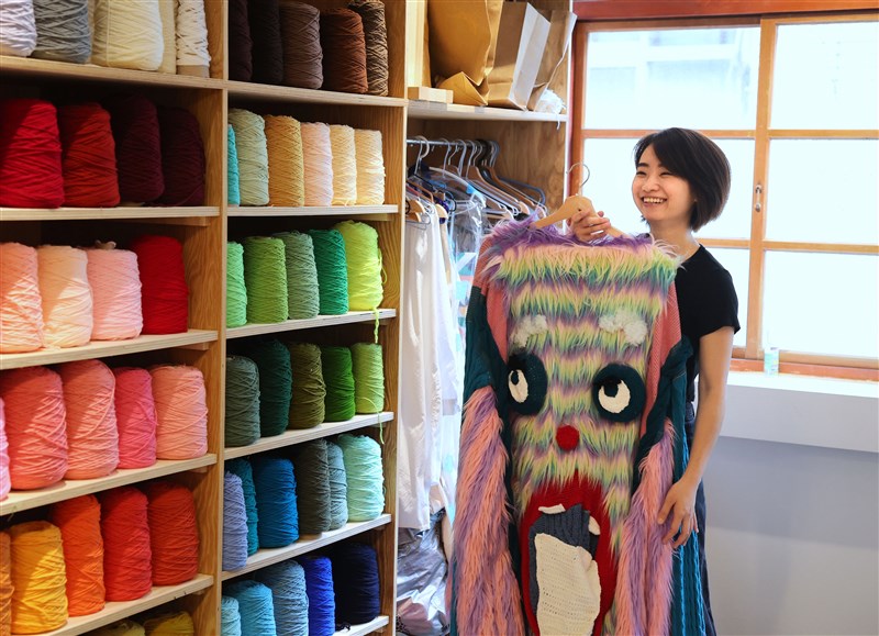 姐妹倆從小和縫紉結緣,喜歡挑戰大型創作,陳亞筑喜愛鑽研布料(上圖),與姐姐共組工作室。「城隍毛線廟」設置於台北霞海城隍廟附近永樂市場,吸引民眾拍照,還有人雙手合十拜拜。