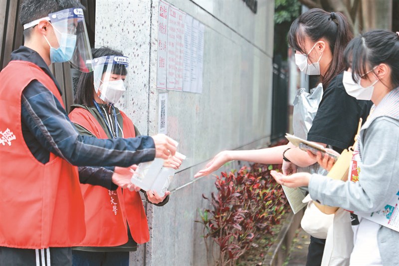 大學分科測驗將開放輕症考生應試,為首個開放確診者的大型考試。圖為今年四技二專統測,考生進考場前消毒手部。圖/資料照片