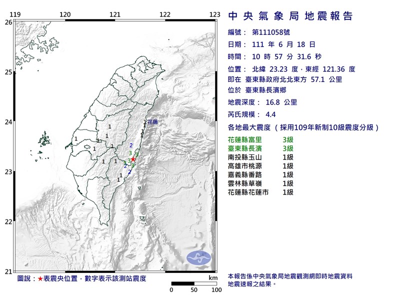 台東地牛翻身 規模4.4地震 最大震度3級 |2022.06.18 語音朗讀 1504觀看次 字級 大 中 小 中央氣象局上午發布第58號顯著有感地震報告,震央位於台東縣長濱鄉。圖/氣象局提供 【本報台北訊】中央氣象局在今日上午發布第58號顯著有感地震報告,震央位於台東縣長濱鄉,深度16.8公里,芮氏規模4.4,花蓮富里及台東長濱都測到3級震度。氣象局測到發震時間為上午10時57分,在台東縣政府北北東方57.1公里 ,位於台東縣長濱鄉,地震深度16.8公里。花蓮縣富里及台東縣長濱測到3級震度,南投縣玉山、高雄市桃源、嘉義縣番路、雲林縣草嶺及花蓮市都測到1級震度。 前一篇文章 夏季氣候來了 連日炎熱午後雷陣雨 下一篇文章 692台斤南瓜冠軍 淡水福容飯店展出 熱門新聞 01【分數之外】看見另一種英文2026.04.0802男子氣概照護員 日本長照新力量2026.04.0503【轉移注意力】往理想中的自己邁進2026.04.0504降雨兩樣情 南部水庫沒解渴2026.04.0605美課藥品重稅 台灣沒優惠 2026.04.0406一紙學歷換錢景 美學位價值遭質疑2026.04.0507租賃車業者違法攬客 觀光署:最高罰200萬元2026.04.0708暴雨狂炸苗栗 災情頻傳 2026.04.0509MLB鄧愷威拆彈 守住今井旅美首勝2026.04.0610【深頁凝視】《後院的鳥》凝神注視鳥兒登場2026.04.05 訂閱電子報 台北市 天氣預報 台灣一週天氣預報 相關報導 清明豪雨 合歡溪出現新堰塞湖火金姑故鄉 賞螢好去處計程車掛牌費喊到35萬元 交部出手塑膠袋之亂 中南部缺貨嚴重杉林溪園區 紫藤花盛開流蘇花 已盛開
