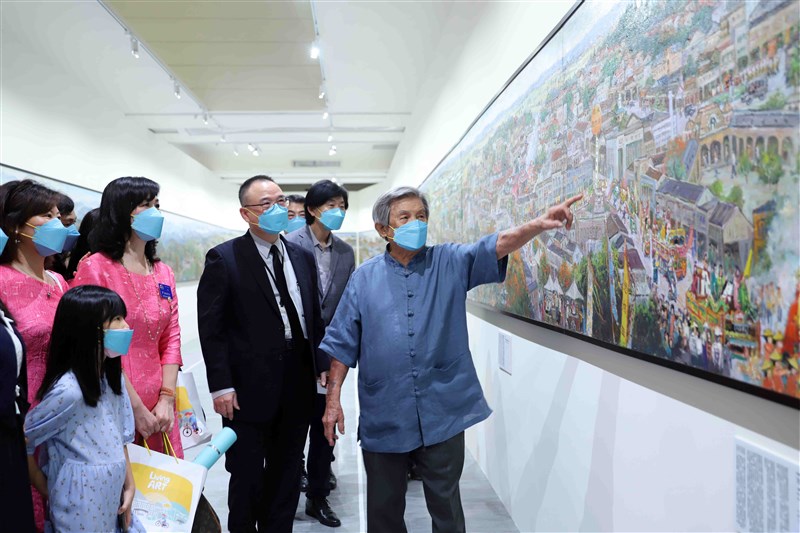 藝術家林智信(右一)今天在開幕式後,為文化部政務次長蕭宗煌(右二)等貴賓導覽作品〈芬芳寶島:憶象1950年代的台灣〉。圖/文化部提供