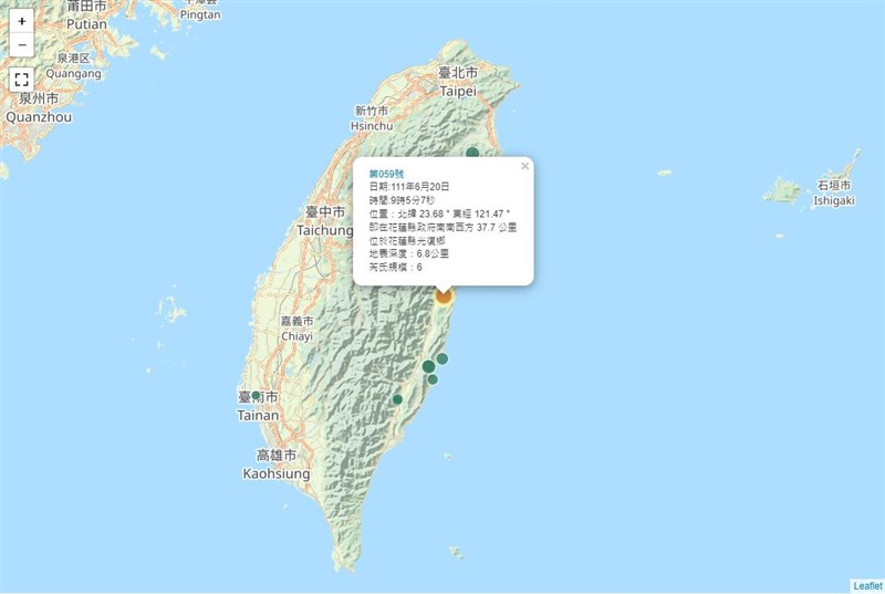 地牛翻身!9:05花蓮地區發生規模 6 地震 |2022.06.20 語音朗讀 1035觀看次 字級 大 中 小 上午9時5左右花蓮地區發生顯著有感地震,地震規模6級地震深度6.8 公里,震央位於花蓮縣光復鄉。圖/人間福報 【本報綜合報導】一日才剛開始地震就報到!上午9時5左右花蓮地區發生顯著有感地震,地震規模6級地震深度6.8 公里,震央位於花蓮縣光復鄉,警戒範圍包括南投縣、彰化縣、花蓮縣、台東縣。圖/中央氣象局中央氣象局地震測報中心表示,6月20日上午9時5左右的地震微第059號,地震規模6級,震央在花蓮縣政府南南西方 37.7 公里 (位於花蓮縣光復鄉),震央位置在北緯 23.68 ° 東經 121.47 °,地震深度6.8 公里。消防局表示,已派遣花蓮縣消防局所屬全部分隊查報災情,目前尚未接獲災情。突然發生地震,讓在地居民感到很驚慌,有人正要出門,錄下搖晃燈具的驚險畫面;還有網友說「這次真的很大」、「鐵門都在搖晃」。各地最大震度;花蓮縣5弱,臺東縣、南投縣4級,台中市、嘉義縣、雲林縣、宜蘭縣、彰化縣、嘉義市、臺南市、新北市3級。上午的有感地震桃園捷運公司立即宣布全線慢速行駛,桃捷公司表示,機場捷運地震偵測系統顯示3級地震,桃捷公司行控中心立即啟動3級地震因應標準作業程序,指示列車停車,待命2分鐘後確認無異狀,降速40公里執行慢速巡檢軌道作業。機捷。圖/資料照片儘管台北市各行政區震度2級,但大安區民眾感受最大,震度有達到3級。台北市副市長黃珊珊上午9時左右第一時間也在臉書發文,問「大家還好嗎?了解有無災情中」,提醒民眾地震發生時記得趴下、掩護、穩住。圖/中央氣象局 前一篇文章 新聞千里眼 下一篇文章 熱翻!全台8縣市高溫特報 留意午後局部雷陣雨 熱門新聞 01【傳燈六十‧百年仰望】星雲大師一筆字書法紀念特展概述2026.01.3002澳網 辛納拚3連霸 小蠻牛盼全滿貫2026.01.3003【紀實攝影】花蓮月光寺 台灣後山的人間淨土2026.02.0104土方之亂推高成本 房價漲壓浮現2026.02.0205佛光山大雄寶殿 逾千僧信迎萬佛2026.02.0106沙漠獅變海洋獅 為人類上了一課2026.02.0107針灸醫療 助癱瘓大象站起來2026.01.3108【人間行者心】一鏟一撬,心路通行2026.02.0109淨心是最好的預防醫學 洛桑加參:找回不生病的力量2026.01.3110【書頁微光】《把牠找回來》 流浪少年變身寵物偵探2026.02.01 訂閱電子報 台北市 天氣預報 台灣一週天氣預報 相關報導 蕭旭岑會王滬寧 強調一中各表蕭:兩岸合作賺世界錢國共論壇登場 藍:兩岸露暖意競選總部成立 黃國昌:3階段推藍白合黃仁勳兆元宴 供應鏈高層到場海鯤艦2度潛航測試 軍事迷喊加油