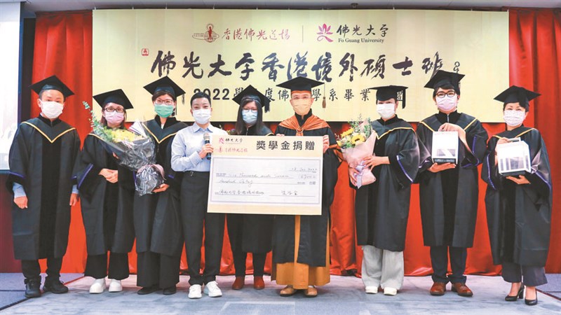 第一屆畢業生發心成立捐助香港碩士專班「獎學金項目」,佛光山港澳深總住持永富法師(右四)代表接受。圖/人間社記者任良民