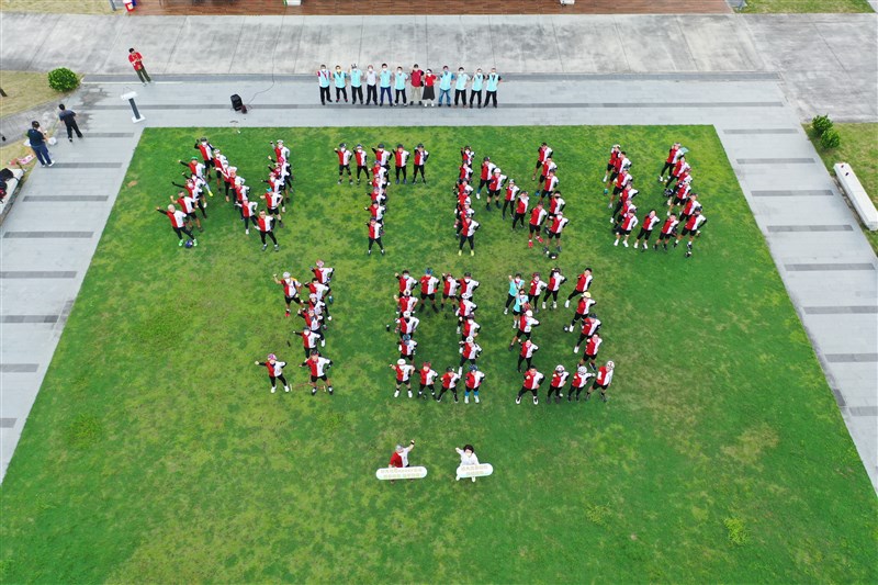 台師大百年校慶鐵騎環島三天抵達嘉義市文化中心前方廣場,排出「NTNU 100」字樣,共同完成空拍壯觀畫面。圖/台師大提供