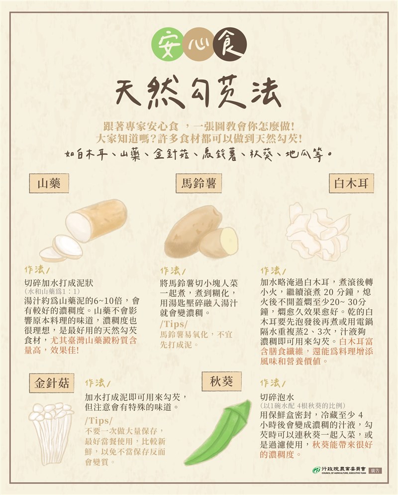 除了太白粉 這5種天然勾芡法吃得更安心 楊旻芳 |2022.06.21 語音朗讀 1068觀看次 字級 大 中 小 圖/123RF 【記者楊旻芳台北報導】台灣人料理常常喜歡勾芡,大多是使用太白粉或是樹薯粉來做勾芡,不過對於健康卻稍有疑慮,其實有許多天然的食材也能做到勾芡的效果,而且以天然食物勾芡吃起來更安心,行政院農委會表示,食材中如白木耳、山藥、金針菇、馬鈴薯、秋葵、地瓜等都能拿來做勾芡,一起來看看吧!圖/行政院農業委員會天然勾芡神器1:山藥作法:切碎加水打成泥狀(水和山藥為1:1),湯汁約為山藥泥的6~10倍,會有較好的濃稠度。並且山藥不會影響原本料理的味道,濃稠度也很理想,是最好用的天然勾食材,尤其台灣山藥澱粉質含量高,效果佳!天然勾芡神器2:馬鈴薯作法:將馬鈴薯切小塊人菜一起煮,煮到糊化,用湯匙壓碎融入湯汁就會變濃稠。不過農委會提醒,馬鈴薯易氧化,不宜先打成泥使用。天然勾芡神器3:白木耳作法:加水略淹過白木耳,煮滾後轉小火,繼續滾煮20分鐘,熄火後不開蓋燜至少20~30分鐘,燜愈久效果愈好。乾的白木耳要先泡發後再煮或用電鍋隔水重複蒸2、3次,汁液夠濃稠即可用來勾。白木耳富含膳食纖維,還能為料理添風味和營養價值。天然勾芡神器4:金針菇作法:將金針菇加水打成泥即可用來勾芡,但要注意的是,金針菇會有一個特殊的味道。另外,農委會建議,金針菇不要一次做大量保存,最好當餐使用,比較新鮮,以免不當保存反而會變質。天然勾芡神器5:秋葵作法:將秋葵切碎泡水(以1碗水配4根秋葵的比例),用保鮮盒密封,冷藏至少4小時後會變成濃稠的汁液,勾時可以連秋葵一起入菜,或是過濾使用,秋葵能帶來很好的濃稠度。秋葵也是一種很棒的天然勾芡食物。圖/123RF 前一篇文章 李永得赴法主持第25屆台法文化獎 羅亞娜、吳坤墉獲殊榮 下一篇文章 中職/第六隊效應!153位選手參加測試會 熱門新聞 01土方之亂推高成本 房價漲壓浮現2026.02.0202【遨遊藝事】巴黎 黛瑪兄弟茶館(Dammann Frères)2026.02.0603向前有路 光明在望2026.02.0504菜市場變書房 攤商兒放學安心讀2026.02.0205極樂寺彩繪燈籠 三好理念廣傳校園2026.02.040610年前震倒115死 台南維冠改建防震7級大樓2026.02.0607佛教藝文本土化 昆士蘭美術館團隊訪中天寺2026.02.050830冊佛教徒必讀經典 台北書展亮相2026.02.0409兩岸新聞營師生 認識人間佛教2026.02.0510立春養生疏肝理氣 飲食調養少酸多甘2026.02.04 訂閱電子報 台北市 天氣預報 台灣一週天氣預報 相關報導 美擬再對台軍售 金額6千億後備軍人教召 改為14天政院:晶片先進製程 我仍領先蕭旭岑會王滬寧 強調一中各表蕭:兩岸合作賺世界錢國共論壇登場 藍:兩岸露暖意 作者其他文章素食需求增2成 台北君悅飯店茶苑供蔬食餐點無心插柳柳成蔭 樸城草食打造植物系美式蔬食店疫情後吃健康 台北凱撒大飯店Checkers轉型蔬食吃到飽餐廳