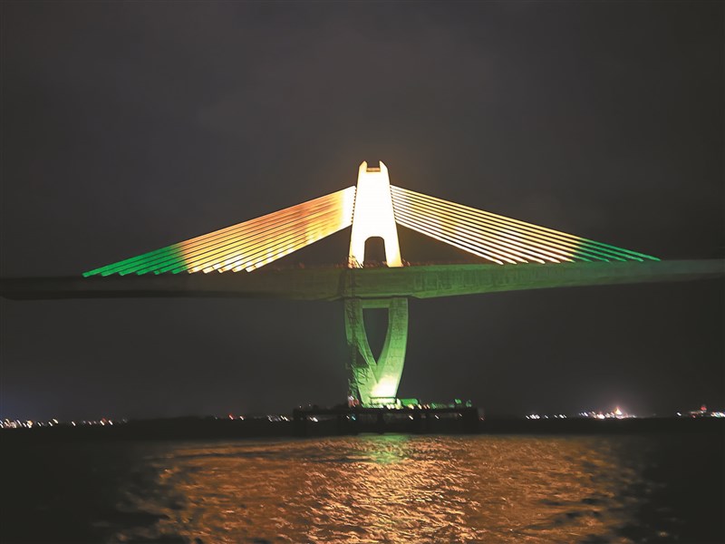 金門大橋預計8月完工,10月通車。昨晚第2次試燈。