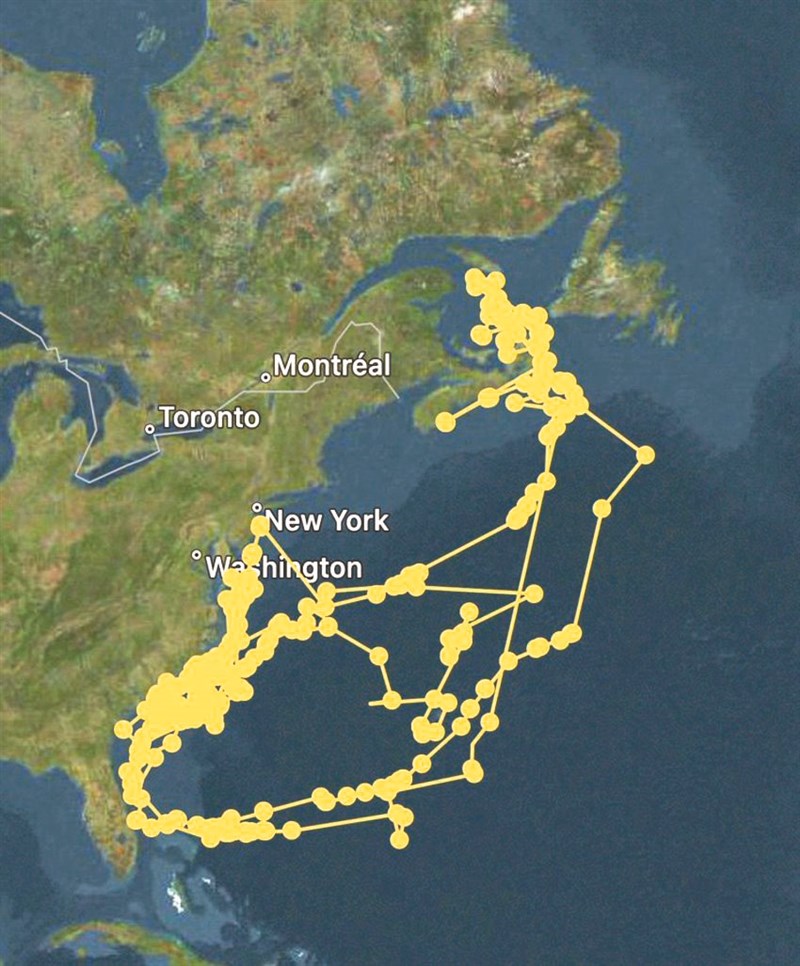根據《新聞周刊》報導,「海洋研究」(Ocearch)在二○二○年曾遇到一隻大白鯊,將牠命名為「Breton」並做標記追蹤,近日發現牠出沒於美國東海岸附近海域,研究員查看牠的游動路線後,發現路徑圖看起來像是一隻沙魚,也讓他們覺得非常有趣,並將圖片分享至推特引發討論。