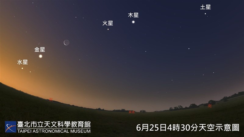 如果想觀賞火星合月與5星同現,建議在明天凌晨4時30分朝平坦開闊的東方低空看,如果天氣好的話,肉眼即可見。圖/取自台北市立天文科學教育館官網