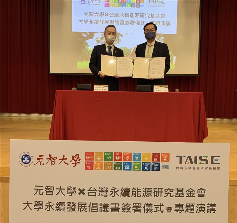元智大學廖慶榮校長(右)代表元智,與台灣永續能源研究基金會簡又新董事長(左)簽署「大學永續發展倡議書」。圖/元智大學提供