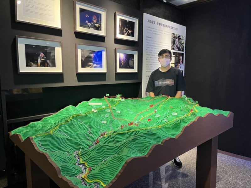 畢展總召林丞恩,本身是賽德克族人,親手製作等比例的德鹿谷村地形模型,讓部落長輩藉模型描述過往打獵事蹟。圖/義守大學提供