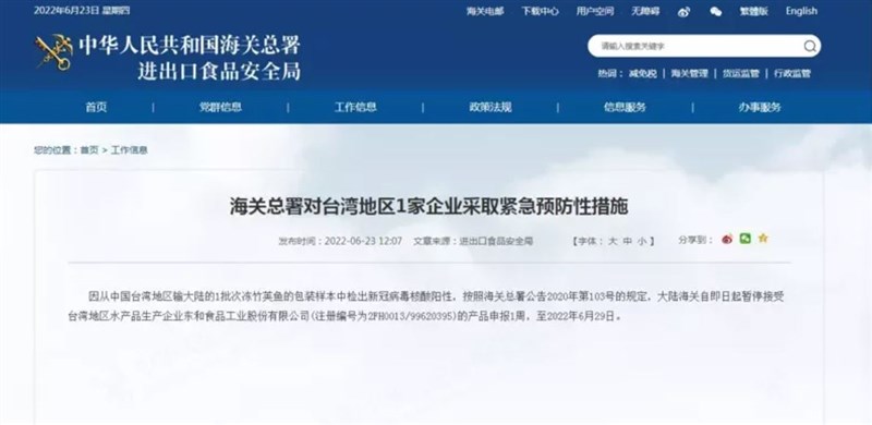 根據公告顯示,中國大陸海關,按照海關總署公告2020年第103號規定,即日起暫停接受台灣水產品生產企業東和食品工業股份有限公司(註冊編號2FH0013/99620395)的產品申報一周,至2022年6月29日。