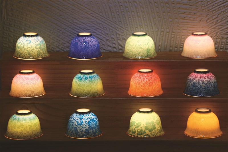 汪麗出生於中國大陸景德鎮的陶瓷世家,被湖州的古陶瓷和絲綢文化吸引,因此在潞村村的老街上開設工作室「隱青.上河居」。她以「釉下青花」的方式,把江南山水畫上杯盞,用「扒花」技藝,將絲綢提花紋化成釉面,希望借助瓷器,把湖州的文化底蘊表現出來。圖為汪麗以「扒花」技藝創作的絲綢花紋杯。圖/新華社