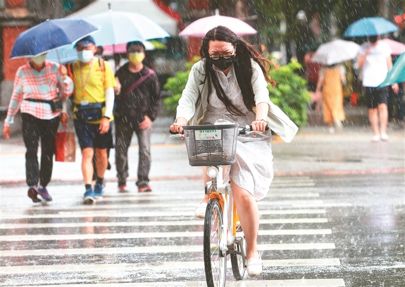 中央氣象局昨日下午針對14縣市發布大雨特報,台北市中山區午後下起大雨,民眾騎腳踏車被淋成落湯雞(圖)。高雄駁二特區有不少民眾把握好天氣,出遊散心。圖/中央社