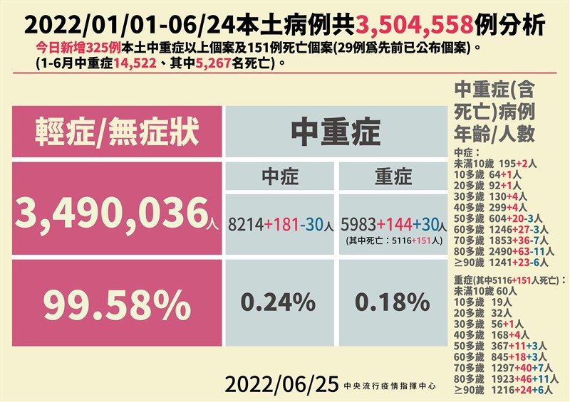 確診病例再降 本土+4萬293 中重症增325例 |2022.06.25 語音朗讀 1140觀看次 字級 大 中 小 確診病例再降。圖/中央社 【本報台北訊】中央流行疫情指揮中心今天(25日)公布國內新增4萬398例新冠確定病例,分別為4萬293例本土個案及105例境外移入;新增325例中重症個案,另確診個案中新增151例死亡。國內今新增325例新冠肺炎中重症個案,包括181例中症、144例重症,新增151例死亡個案。指揮中心發言人莊人祥表示,今日最年輕死亡個案為30多歲女,本身有乳癌病史,染疫後出現肺炎且癌症轉移,不幸死亡。莊人祥表示,今年至6月24日共累計1萬4522例中重症案例,5267例死亡案例,目前輕症無症狀案例占比99.58%。今新增151例死亡案例,其中140人有癌症等重大疾病或慢性病史,96人沒有打滿三劑疫苗,80人年齡超過80歲。針對今日最年輕死亡個案,莊人祥表示,這名30多歲女性,本身有乳癌病史,沒有施打任何疫苗,於6月4日採檢陽性確診,6月12日死亡,死因主要為新冠肺炎及乳癌轉移。另外一名60多歲女性,本身有肥胖等慢性疾病,BMI超過30,6月11日因肺炎、腎衰竭等到急診就醫,6月12日確診陽性,院方立刻給予瑞德西韋等藥物,但治療後仍未好轉,6月20日不幸死亡,死因為肺炎併呼吸衰竭。圖/指揮中心提供昨疫苗接種共有11萬1645人次,目前國內疫苗涵蓋率第一劑91.24%,第二劑82.98%,追加劑69.9%。昨日確診數約4.5萬,今日降至4萬初,莊人祥說,每周二、三新增病例數較多,周五、六、日、一會降低,預估近日單日確診數約在3、4萬左右。指揮中心表示,今日新增之4萬293例本土病例,個案分布為台中市6075例、高雄市5567例、新北市5142例、台南市3603例、桃園市3272例、彰化縣3068例、台北市2806例、屏東縣1759例、雲林縣1291例、新竹縣1015例、苗栗縣983例、南投縣921例、嘉義縣819例、新竹市791例、宜蘭縣702例、嘉義市591例、花蓮縣586例、基隆市525例、台東縣450例、澎湖縣193例、金門縣112例、連江縣22例。圖/指揮中心提供 前一篇文章 人潮回來了 北捷7月起逐步恢復假日區間車 下一篇文章 休假日晚睡晚起 「社交時差」對健康不利 熱門新聞 01南華大學茶禪雅集 靜坐書寫時光膠囊2026.03.2602星雲大師靈骨分燈歐洲 傳燈萬方2026.03.2603【詩】白花鬼2026.03.2504佛光山365日越文版 贈西貢日航大酒店2026.03.2705紅綠葡萄抗氧化抗發炎 連皮吃獲取健康全效益2026.03.2706台灣工藝3專書 呈現文化獨特樣貌2026.03.2707兒童節禮物 新北學生自己票選2026.03.2608伊朗設安全走廊 陸船復航荷莫茲2026.03.2509全球首例 菲國進入能源緊急狀態2026.03.2610北京中學老師 精準預言美伊開戰2026.03.26 訂閱電子報 台北市 天氣預報 台灣一週天氣預報 相關報導 宜蘭綠博會 探索真理乾旱嚴峻 雲林古坑春茶產量腰斬中職開幕戰 猿隊險勝兄弟佛光山月光寺啟用 花蓮心靈新地標雲林最炫兒童節 孩童搭乘熱氣球長照3.0增「互助喘息」 用服務換照顧