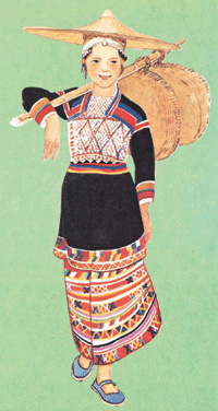 女子普遍戴耳環與手鐲,腳著木履、涼鞋、布鞋或跣足,外出勞動時總要戴頂尖頂大斗笠。在趕集或遊玩時喜歡手持一把美麗的小綢傘,身掛長帶帶穗彩織方包,顯得十分窈窕秀美。