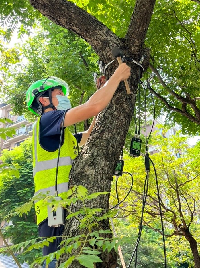 健檢人員使用應力波檢測樹木內部是否腐朽。圖/公園處提供