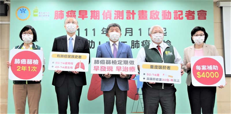 國健署長吳昭軍表示,肺癌篩檢是目前提供的四癌篩檢之外(子宮頸癌、乳癌、口腔癌、大腸癌),依據國際實證及國內研究結果,並經專家及相關學會討論訂定的癌症篩檢政策,而推出的第五癌篩檢。請符合資格之民眾洽詢參與本計畫之辦理醫院,踴躍篩檢,早期診斷,早期治療。