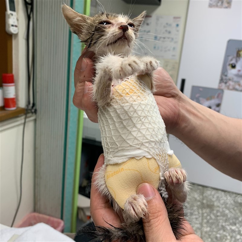 動保員天天清創換藥包紮,小貓像春捲一樣被包覆,而一個月後奇蹟恢復健康;動保處表示,每一個生命都很可貴。圖/新北動保處提供