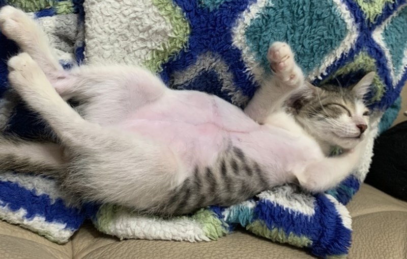 換包紮需要2人協力,由於腹部沒有肚皮,傷口大面積與紗布沾黏,都要用生理食鹽水澆灌紗布才能慢慢取下,令人驚訝的是,小貓清創換藥時相當乖,經過一個月每日的細心照料,小貓長出新皮膚,還會在辦公室內跳上跳下,不時撒嬌。