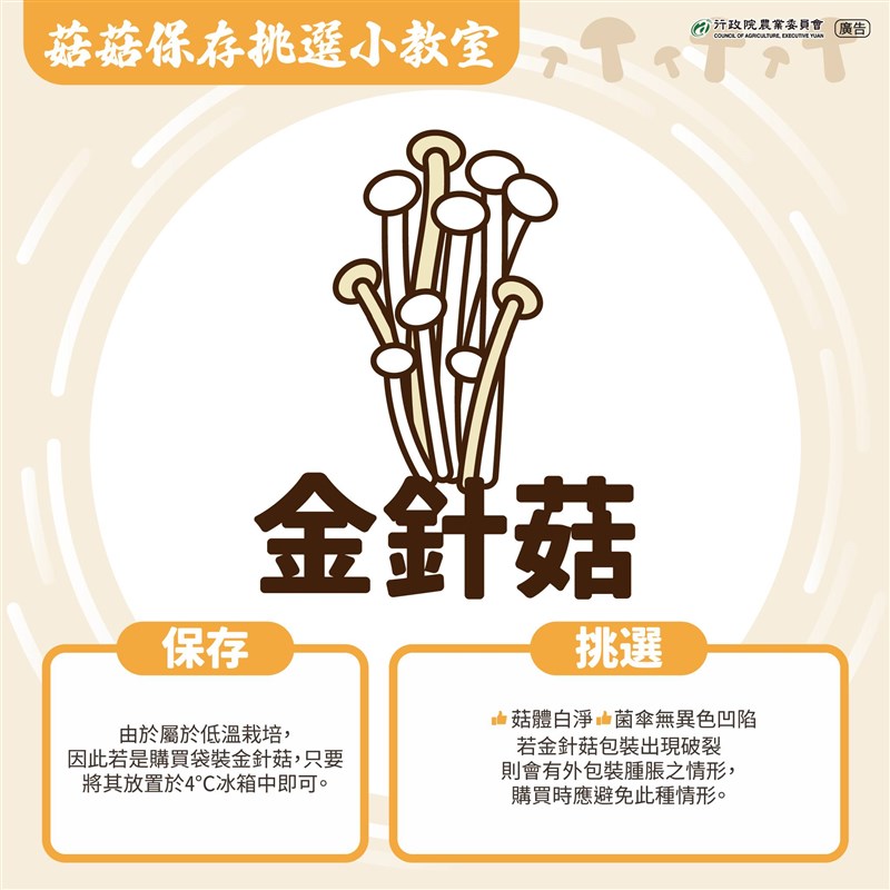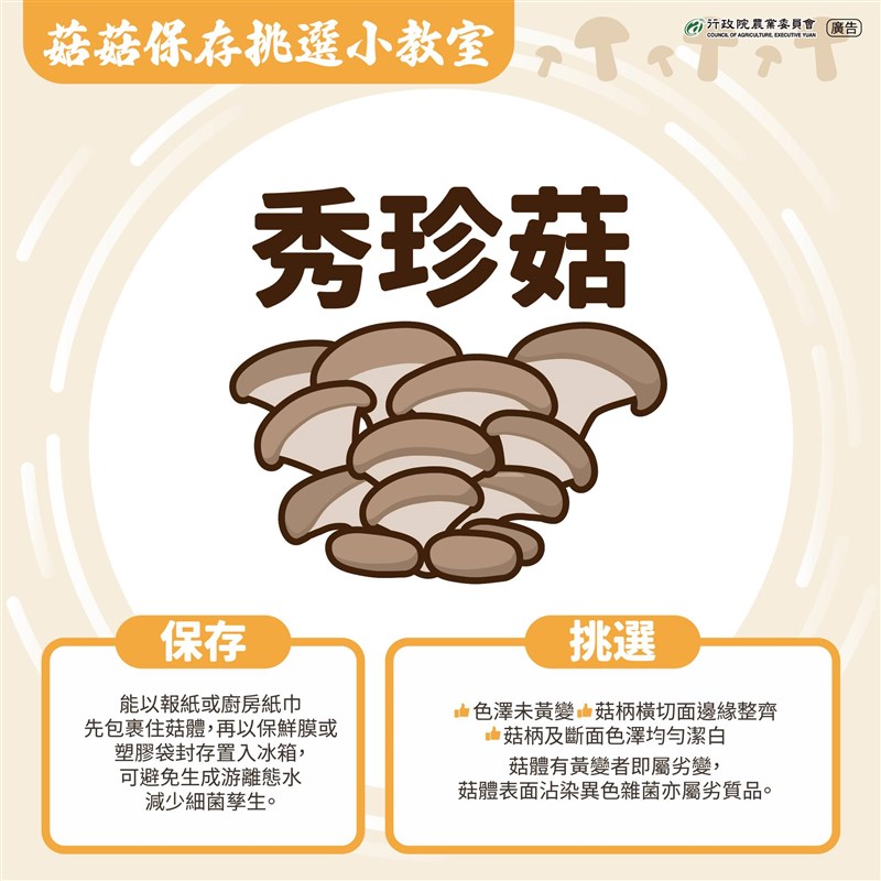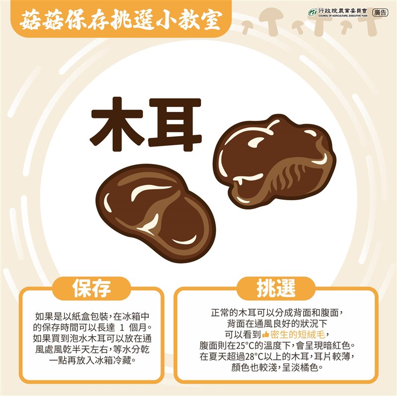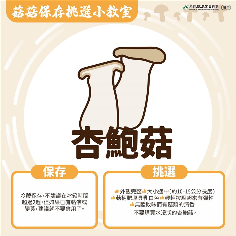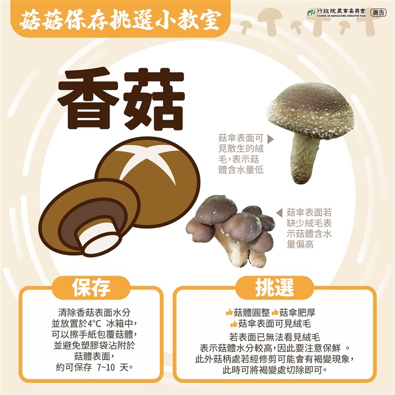 菇類這樣挑選保存 更耐放 |2022.07.04 語音朗讀 1730觀看次 字級 大 中 小 圖/123RF 【記者楊旻芳台北報導】菇類營養價值高,有高纖、低熱量特性,豐富的維生素D,是許多人會選擇的食物之一,但是菇菇買回家後卻不知道應該怎麼保存,買個幾天就不新鮮,根據行政院農業委員會指出,其實不同的菇菇有不同的保存技巧,購買時的挑選方法也大有學問!一次看懂各種常見菇類如何保存挑選。行政院農業委員會分享香菇、金針菇、杏鮑菇、木耳、秀珍菇、洋菇的保存挑選方式,很多人通常菇菇買回家就直接冰進冰箱,其實正確保存可以延長保存的天數。香菇的挑選與保存挑選香菇時,可以選擇菇體圓整、菇傘肥厚,另外可看「菇傘」,菇傘表面可見散生的絨毛,表示菇體含水量低、菇傘表面若缺少絨毛表示菇體含水量偏高。若無法看見絨毛表示菇體水分較高,因此要注意保鮮。若菇柄處若經修剪可能會有褐變現象,此時可將褐變處切除即可。保存香菇時可先清除香菇表面水分,並放於4度C冰箱中,可以用擦手紙包覆菇體,並避免塑膠袋沾附於菇體表面,約可保存7~10天。金針菇的挑選與保存購買金針菇以菇體白淨、菌傘無異色凹陷為佳,並且避免選購包裝出現破裂則會有外包裝腫脹。金針菇的保存非常簡單,由於屬於低溫栽培,因此若是購買袋裝金針菇,只要將其放於4度C冰箱中即可。木耳的挑選與保存正常的木耳可以分成背面和腹面,背面在通風良好的狀況下可以看到密生的短絨毛,腹面則在25度C的溫度下,會呈現暗紅色。在夏天超過28C以上的木耳,耳片較薄,顏色也較淺,呈淡橘色。木耳如果是以紙盒包裝,在冰箱中的保存時間可以長達1個月,如果買到泡水木耳可以放在通風處風乾半天左右,等水分乾一點再放入冰箱冷藏。秀珍菇的挑選與保存袖珍菇要挑選色澤未黃變,菇柄橫切面邊緣整齊、菇柄及斷面色澤均勻潔白,要注意如果菇體有黃變即屬劣變,菇體表面沾染異色雜菌屬劣質品。可以用報紙或廚房紙巾先包裹住菇體,再以保鮮膜或塑膠袋封存置入冰箱,可避免生成游離態水減少細菌生。洋菇的挑選與保存洋菇首先澳先挑選外觀完整無變形、沒有因碰撞擠壓導致的褐化傷痕、無異味為佳。洋菇是少數可以生食的菇類,但因栽培過程中會接觸到自然環境中的微生物,建議還是經過清洗或殺青後再食用。洋菇可以冷藏或冷凍保存,冷藏可以將菇體表面以紙巾擦乾,並於紙袋中吸附菇體散發的水蒸氣,洋菇可在冰箱冷藏中7天左右的保鮮期;另外也可以在殺青後冷凍或直接冷凍,約可維持數個月的保鮮期。杏鮑菇的挑選與保存杏鮑菇挑選盡以外觀完整大小適中(約10-15公分長度),菇柄肥厚具乳白色,輕按壓起來有彈性無酸敗味而有菇類的清香不要購買水浸狀的杏鮑菇。杏鮑菇以冷藏保存,不建議在冰箱時間超過2週,但如果已有黏液或變黃,建議就不要食用了。 前一篇文章 美式賣場衛生紙再漲價 國內紙廠業者:調漲勢在必行 下一篇文章 國旅旅宿名單公布 預算有限先搶先贏 熱門新聞 01動物的精采瞬間(下)2026.02.2202房市冷 仲介業跨足都更危老整合2026.02.2103朝山叩鐘 佛光山嶄新大雄寶殿迎春 2026.02.2104佛光山平安燈會 逾百萬人朝聖2026.02.2305光照大千璀璨登場 點亮和諧共生新希望2026.02.2106台北道場 新春禮千佛2026.02.2107Q版初代超人力霸王 領航愛河灣2026.02.2108南投燈會 佛光山鳳凰主燈傳送光明2026.02.2109陸AI機器人秀功夫 驚豔全球2026.02.2110【詩】紅豆控的紅龜粿2026.02.23 訂閱電子報 台北市 天氣預報 台灣一週天氣預報 相關報導 藍軍購條例 敲定111億美元春節海運日均1.8萬人次 成長10%韓:總統願赴立院國情報告金門機場候補數百人 軍機連2天疏運七股科技工業區 招商有成春節連假 海軍維安