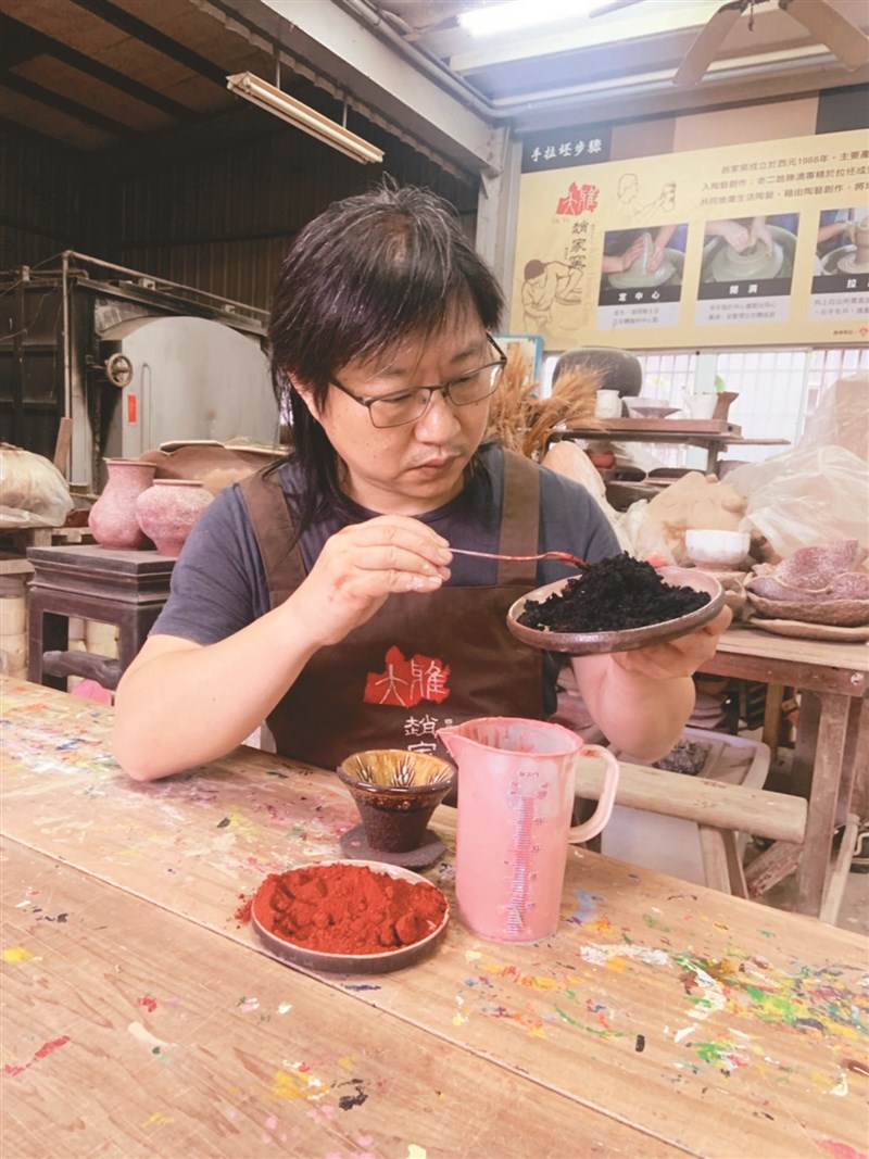 趙勝傑正在調配麥灰,與紅土的比例。圖/趙家窯提供