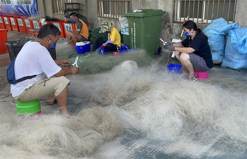 金門縣政府輔導漁會在新湖漁港設置廢棄漁網暫置分類作業區,並由台灣化學纖維公司定期回收再利用。圖/中央社