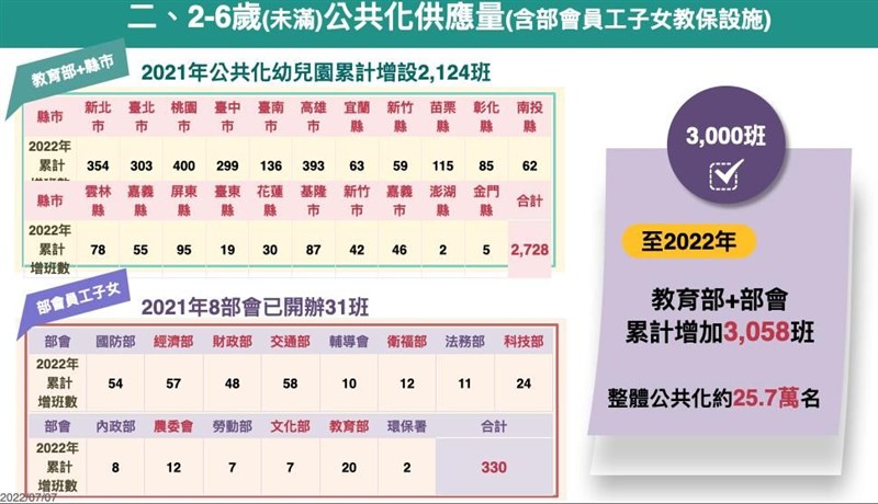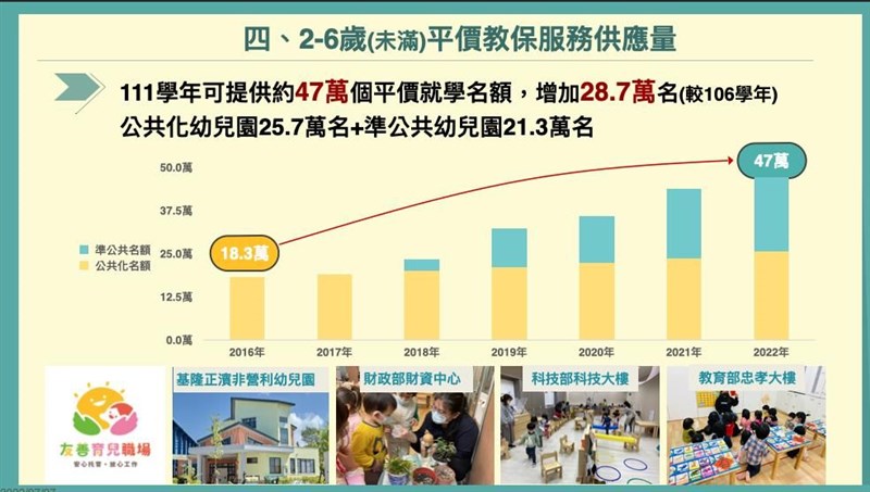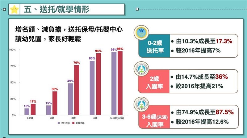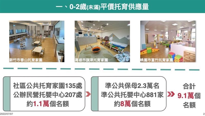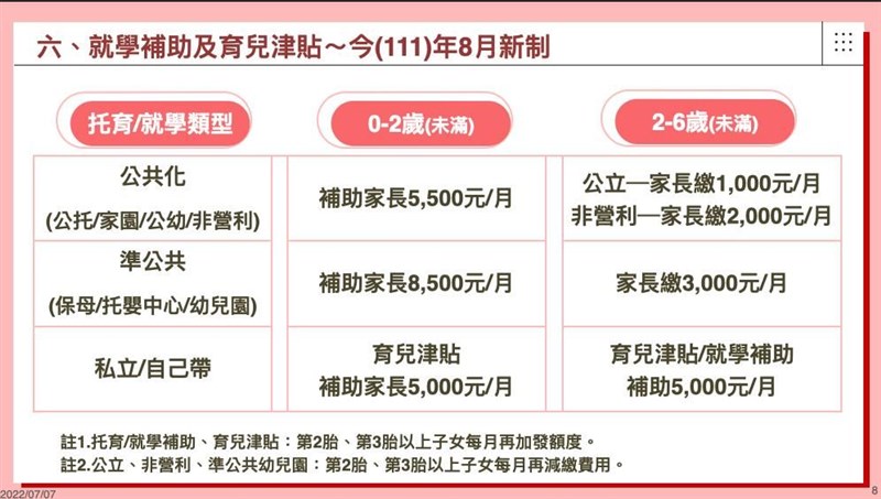 育兒托育補助加碼 8月津貼增至5千元、學費降低3千內 |2022.07.07 語音朗讀 1024觀看次 字級 大 中 小 8月起育兒津貼,將從現行每月新台幣3500元提高至5000元。圖/中央社 【本報台北訊】為落實蔡英文總統在大選期間曾提出的「0至6歲國家一起養」政策,行政院會去年拍板,去年8月起,育兒津貼提升為3500元,托育補助增為7000元;今年8月,兩者再加碼1500元,且條件也多所放寬,例如過往第三胎才加碼補助,這次提前至第二胎,鼓勵國人生養。育兒托育補助8月加碼。圖/教育部提供教育部今天到行政院報告「少子女化對策成果報告—0至6歲國家跟你一起養」。行政院發言人羅秉成在行政院會後轉述,行政院長蘇貞昌在會中表示,明年將投入近千億元,除大幅提高預算,也透過修法、調整政策,跨部會減輕育兒家庭負擔。教育部針對「增名額、減負擔、加津貼」說明。教育部表示,擴大平價教保富量部分,0到2歲(未滿)今年6月累計增設公共化托育342處,整體平價名額約9.1萬名;2到6歲(未滿)部分,公共化幼兒院提前在今年達成增設3000班之目標。育兒托育補助8月加碼。圖/教育部提供學費降低加碼方面,針對就讀公共化及準公共托育機構的幼兒,今年8月再降低費用。2歲以下的幼兒送去公共化托嬰中心、社區家園,和準公共托嬰中心和保母,今年8月開始,每個月托育補助再加1,500元,第2胎、第3胎以上、低收入戶及中低收入戶幼兒的補助再增加。就讀公共化及準公共幼兒園的2至6歲(未滿)幼兒,今年8月起,就學費用再降低,家長每月最多只要繳3000元;就讀公幼每月甚至只要繳交1,000元,第2胎以上子女、低收入戶及中低收入戶家庭子女上學「免費」。育兒托育補助8月加碼。圖/教育部提供育兒津貼也同步加碼,教育部表示,今年8月起,家長自己帶或就托未加入準公共的私立托嬰中心或私立幼兒園的小朋友,第1胎育兒津貼每月發放額度提高到5000元,第2胎每月6000元、第3胎以上每月7000元。另外,一般私立幼兒園的5至6歲(未滿)小朋友,今年8月起,由家長自己申請辦理,就學補助的作業方式及額度也比照津貼辦理,並於次月月底前撥付至家長指定帳戶。育兒托育補助8月加碼。圖/教育部提供蘇貞昌表示,除了商業醫院、政府機關、公營事業等得設置較保中心,也積極申辦社會住宅,去年也投入近百億營造友善生養環境。蘇貞昌盤點,擴大不孕補助已經有4萬多件通過審查、26000人獲得補助,對比109年整年度才19件,有如是天壤之別,有2100多對夫妻、產下2400多名嬰兒,若再往下推動, 預計明年底可產下嬰兒達到1萬2000多名。育兒托育補助8月加碼。圖/教育部提供蘇貞昌說,提高育嬰留停從6成提高到8成、兩成由政府補助方面,申請人數比前年同期增加三成,受惠人數將近十萬人。他說,放寬育嬰留停申請彈性,男性申請人數大幅成長,從2100人成長到5400人,打1.5倍,可增加男性負擔育兒責任。育兒托育補助8月加碼。圖/教育部提供 前一篇文章 Novavax開打 各縣市預約、注意指南 下一篇文章 危老重建5年受理3052件 租稅減免延長 熱門新聞 01元旦寶寶 桃園、新竹市逆勢成長2026.01.0202【易經花藝】花開之處 便是易境2026.01.0403嘉義蘭潭大白熊 可愛造型好療癒2026.01.0204每年吸走6500萬噸 浮游生物幫地球儲碳2026.01.0405泡腳茶飲按穴位 小寒養生重溫補2026.01.0206【人間行者心】感恩心背《金剛經》2026.01.0407滋補暖胃 小寒節氣蔬食養生2026.01.0508名醫聯手破解 異膚獲得全方位照護2026.01.0309星雲大師全集【傳記】百年佛緣─生活篇 我的人間性格 3 - 32026.01.0210溫補暖身節氣料理2026.01.05 訂閱電子報 台北市 天氣預報 台灣一週天氣預報 相關報導 櫻花鉤吻鮭 復育成效佳外送員專法三讀 每單報酬保底45元南投山區 梅花盛開總預算卡關 北基擬先墊付TPASS經費台鐵集集線 首階段復駛台南永康工業區失火 黑煙竄天幸無人傷亡