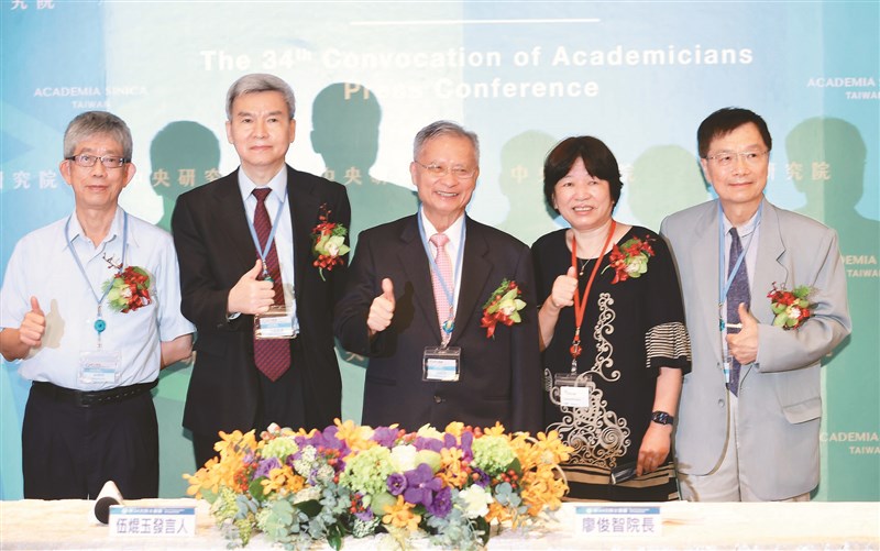 中央研究院第33屆院士暨名譽院士名單昨日揭曉,新當選的院士施明哲(左起)、司徒惠康、林昭庚、林麗瓊、唐堂等五名院士代表出席記者會,受到與會人士道賀。圖╱林俊良