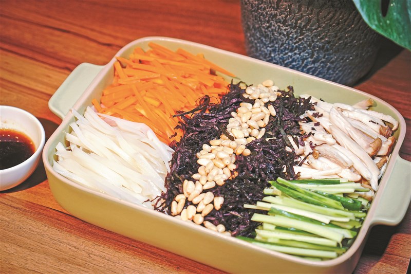 3、所以食材煮好後,依序放入盤中,最後灑上松子,可以搭配和風醬享用,便是清爽可口的涼拌佳餚。