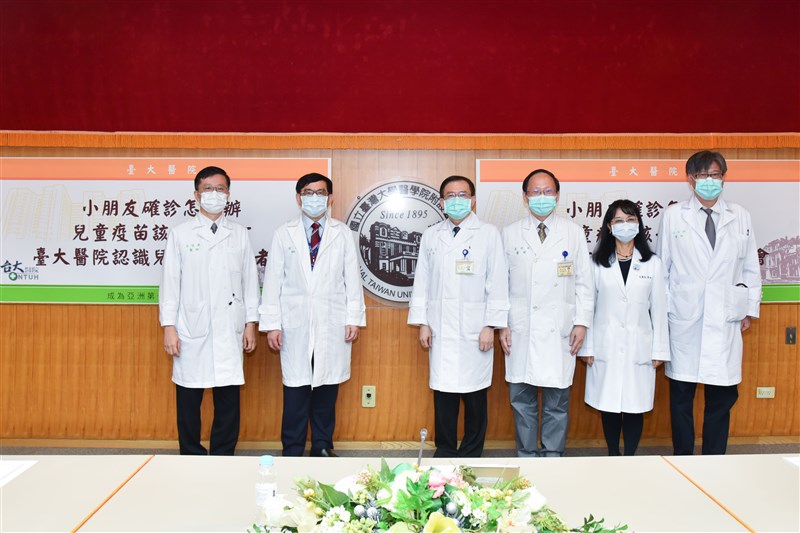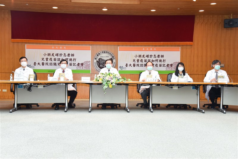 台大醫院小兒部副主任張鑾英(右二)說,通常家中有人確診,兒童約9成會遭到感染,提醒家長應儘早讓兒童施打疫苗,提升保護力。 圖/台大醫院提供
