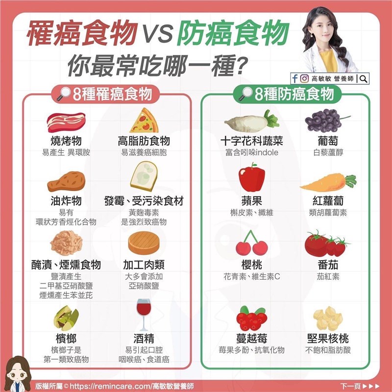 罹癌食物VS防癌食物 你最常吃哪一種? 陳玲芳 |2022.07.08 語音朗讀 1165觀看次 字級 大 中 小 十字花科蔬菜如花椰菜,以及含類胡蘿蔔素的紅蘿蔔,以及富含茄紅素的番茄,都是極具代表性的防癌蔬菜 。圖/pexels 【記者陳玲芳專題報導】癌症,已蟬聯40年台灣十大死因之首。營養師表示,癌症其實是可以預防及避免的,所謂「病從口入」,最有效的方式就是從飲食方面加以控制,同時改善生活習慣,降低慢性病發生風險。由於乳癌是女性癌症罹患率第一名,根據國健署統計,每天約有31位女性被確診乳癌,怎麼做可以預防乳癌發生?營養師建議「5避開、5多吃」。營養師高敏敏說,現代人生活壓力大、作息不佳,因此常靠「吃大餐」或燒烤、油炸、甜食來刺激味蕾,日積月累,導致發生癌症的機率也愈來愈高,甚至高居國內死因首位。癌症,又稱惡性腫瘤,是人體內一些突變細胞不正常的增殖,而癌細胞繁殖速度非常快,且具有高度侵犯性及轉移性,所以導致器官病變、功能喪失乃至死亡。儘管你我都明白,飲食均衡、作息正常、規律運動,皆與健康息息相關,卻有不少人「知道,卻做不到」。其實,想要有健康的身體,就得懂得「趨吉避凶」、避開危險因子。除了節制口腹之慾,不妨從日常生活中好好反思、檢討「罹癌食物」與「防癌食物」,你最常吃哪一種?罹癌食物 三思而後食高敏敏歸納8種「罹癌食物」,提醒大家「三思」而後「食」。1.燒烤物:肉類經高溫燒烤,會產生癌物質,如異環胺,增加罹癌風險。2.油炸物:易有環狀芳香烴化合物,可能導致大腸直腸癌。3.高脂肪食物:易滋養癌細胞,除了癌症之外,也容易造成心血管疾病、腦中風等風險。4.發霉、受汙染食材:如黃麴毒素,是強烈致癌物,容易傷腎、傷肝。5.醃漬、煙燻食物:鹽漬食物易產生「二甲基亞硝酸鹽」,煙燻易產生「苯並芘」,皆屬致癌物。6.加工肉類 :加工肉屬一級致癌物,大多會添加「亞硝酸鹽」,可能導致罹患大腸癌風險。7.檳榔:檳榔子,是第一類致癌物,常食用會導致口腔黏膜下纖維化,造成口腔癌。8.酒精:飲酒所產生的乙醛,屬於一級致癌物,易引起口腔癌、咽喉癌、食道癌等。 圖/高敏敏營養師提供防癌食物 三餐別忘它她也歸納8種「防癌食物」,建議大家「三餐」別忘「它」。1.十字花科蔬菜:如花椰菜,富含吲哚indole,為防癌物質。2.蘋果:槲皮素、纖維等,幫助降低腫瘤風險。3.櫻桃:花青素、維生素C,可降低癌症機率。4.蔓越莓:含有莓果多酚等抗氧化物,有助防癌。5.葡萄:白藜蘆醇,可減緩癌細胞生長、抑制腫瘤。6.紅蘿蔔:類胡蘿蔔素,能幫助抗癌。7.番茄:茄紅素,能預防腫瘤、阻止癌細胞增殖。8.堅果核桃:不飽和脂肪酸,可減緩癌症延展速度。5「避開」與5「多吃」「5避開」包括1.肥胖:肥胖是乳癌的危險因子 建議平時將BMI控制在<27以內。2.高油飲食:飽和脂肪酸高的食物容易促進荷爾蒙分泌、誘發身體發炎,增加乳癌風險。3.高溫烹煮的烹調方式:如油炸、大火炒等,會造成自由基過多,增加細胞病變機率。4.酗酒、抽菸:研究證實過量酒精、抽菸,會提高乳癌罹患率。5.塑膠製品:遠離環境荷爾蒙,塑膠杯、塑膠袋使用要注意,避免干擾身體荷爾蒙運作。營養師主張的「5多吃」包括「選對好油」,建議烹調用油使用不飽和脂肪酸高的「植物油」,如橄欖油、苦茶油、亞麻籽油等。圖/pexels「5多吃」包括1.優質蛋白質食物:如大豆類製品,可降低身體的發炎反應。2.多攝取十字花科食物:例如高麗菜、花椰菜、小白菜、白蘿蔔等,可減少自由基,降低乳癌發生。3.高纖食物:膳食纖維可以幫助油脂代謝,建議吃糙米、薏仁、燕麥、地瓜葉、黑木耳、菇類等。4.每天適量豆類製品:如豆腐、豆漿、豆干等,有豐富的大豆異黃酮,有助預防乳癌。5.選對好油:建議烹調用油使用不飽和脂肪酸高的「植物油」,如橄欖油、苦茶油、亞麻籽油等。 前一篇文章 防疫護國3度敲警鐘 醫師沈泰龍辭世 下一篇文章 長新冠看中醫 三伏貼驅除體內寒氣 熱門新聞 01渥太華佛光山 授海狸童軍領巾2025.11.1702【詩】遊園地.競馬場2025.11.1703警告日本 陸黃海軍演、籲暫勿遊日 2025.11.1604落葉刺繡 巴西百鳥寫真集2025.11.1705墨西哥熱氣球節 高空爭豔2025.11.1606芬普尼毒蛋 又爆4萬顆流入市面2025.11.1607克林姆富家女肖像畫 估值46億元2025.11.1708【快樂塗鴉簿】熱鬧的內灣小鎮2025.11.1709中日緊張 陸4海警船巡航釣魚台2025.11.1710AMR機器人 是什麼?2025.11.17 訂閱電子報 台北市 天氣預報 台灣一週天氣預報 相關報導 暖身加收操 避免天冷運動傷害小雪時節避風防寒 黑色食物溫補養腎5天然護胃食材 緩解胃脹、胃痛壓力大蕁麻疹易上身 改善飲食作息防發作少糖多運動 穩定睪固酮改善疲態多吃蔬食少糖少油炸 營養均衡啟動代謝力 作者其他文章小雪時節避風防寒 黑色食物溫補養腎少糖多運動 穩定睪固酮改善疲態守護偏鄉 台東早產兒日點燈寒士吃飽30 楊婷婭籲助弱勢罕病病友創作 綻放希望大稻埕走秀 視障者展現自信