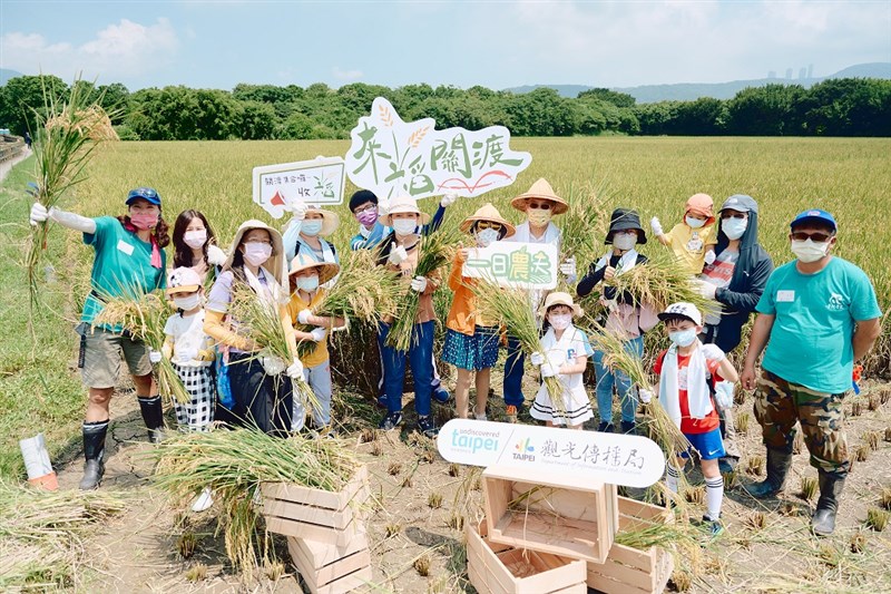 「2022來稻關渡—收稻體驗」登場,讓大小朋友體會農民栽種的辛勞,也感受都市難得農家樂趣。圖/台北市觀傳局提供
