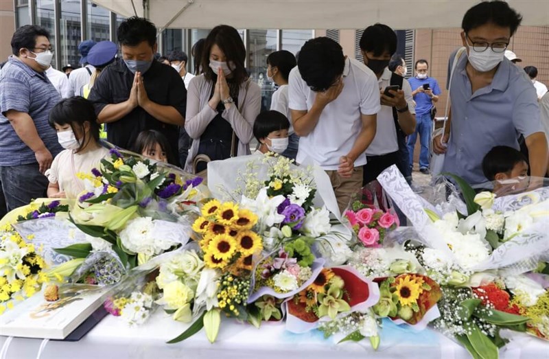 日媒Sponichi Annex報導,獻花台設置在事發現場的奈良市近鐵大和西大寺車站外附近,今天上午開始到場追悼安倍的民眾絡繹不絕,排隊人龍一度長達350公尺;加上獻花數量太多,工作人員不得不增設新的獻花台。