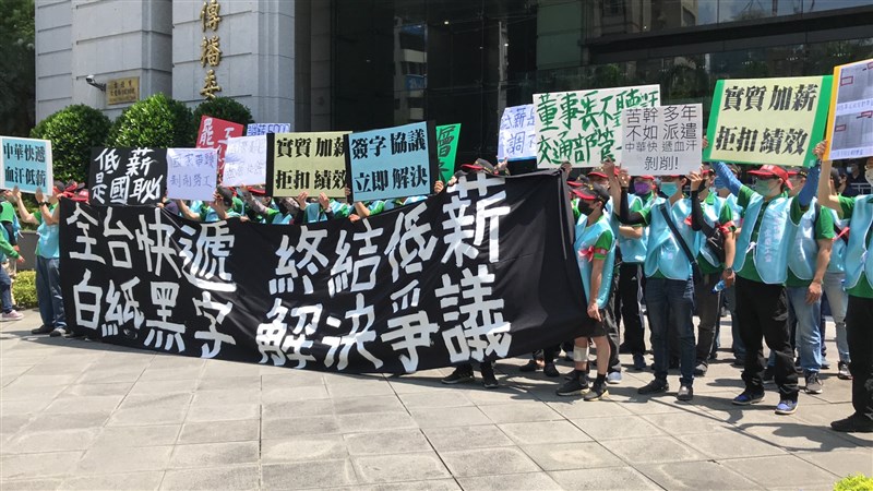 【本報台北訊】中華快遞員工底薪不到3萬元,北中南工會上百名成員今天搭乘遊覽車到交通部前抗議,要求中華快遞高層白紙黑字承諾加薪5000元且不扣績效獎金,今天下午勞資協商,中華快遞董事長黃振忠簽下協議書同意工會六大要求,工會表示,明天將正常上班、不會全台大罷工。