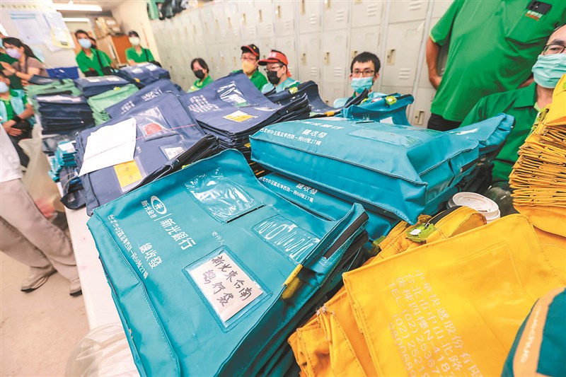 中華快遞工會昨天抗爭取得成果;據估計,若原本罷工成行,將導致八百家銀行運送票據等業務受影響。圖為各家銀行的收發袋。