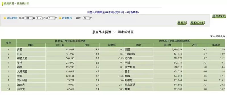 大陸多年來蟬聯我國農產品外銷最大國,今年上半年受到大陸水果禁運令的影響,我國農產外銷板塊挪移,中國大陸退至第3名,美國首度成為我國農產外銷的第1大國,第2名則是日本。圖/截圖自農委會官網