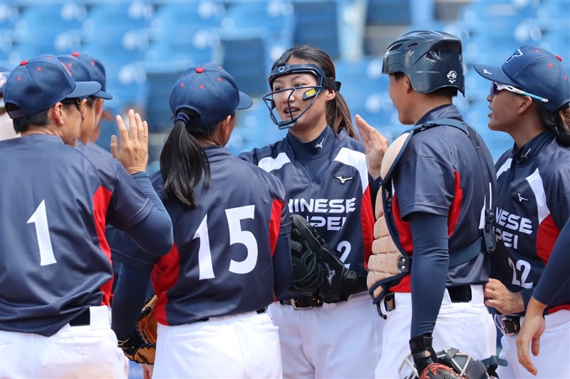 中華女壘隊擊敗義大利隊,順利晉級四強,隊員們擊掌打氣。圖/體育署提供