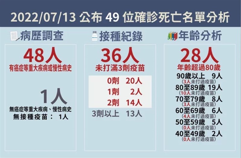 死亡個案年齡分布為40多歲至90多歲,48人具慢性病史、36人未接種滿三劑、28人超過80歲以上。其中最年輕死亡個案為兩例40多歲男性。