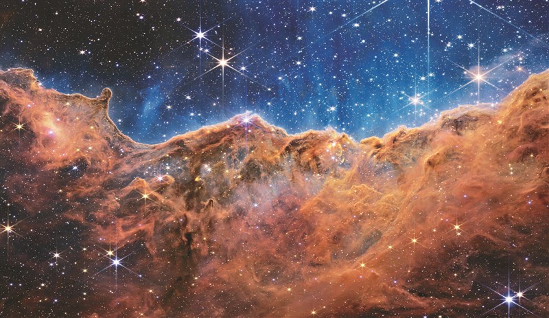 最後一張圖片則是「船底座星系」(Carina Nebula),絢麗、巨大且明亮的星系相當吸引人,是目前已知最大的星系育成區之一,一個名為「NGC 3324」年輕恆星形成區域中「山脈」和「山谷」,這座「宇宙懸崖」距離地球7600光年。由於韋伯能穿透宇宙塵埃的紅外線觀測能力,研究人員可辨別出新生恆星中噴出的氣泡、噴流及數百顆以前從未見過的恆星。