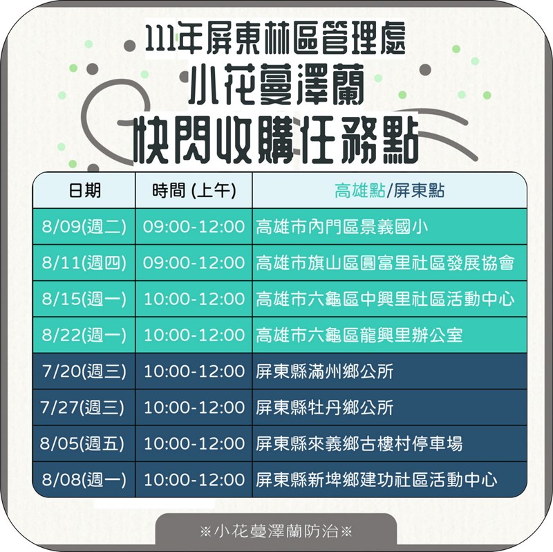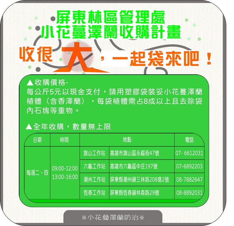 移除綠癌 小花蔓澤蘭1公斤5元 高屏8場快閃收購 |2022.07.14 語音朗讀 2183觀看次 字級 大 中 小 小花蔓澤蘭攀附危害樹木。圖/取自維基 【本報屏東訊】「綠癌」小花蔓澤蘭分布在海拔一千公尺以下廢耕農地、果園、山坡地,一旦被小花蔓澤蘭攀附覆蓋,無法行光合作用而致死,危害本土植物生長。屏東林管處指出,每年10月到隔年2月是小花蔓澤蘭開花結果期,9月前是移除最適合期,林管處7、8月在高屏地區舉辦8場快閃收購,每公斤5元,現金發放無上限。屏東林管處7、8月舉辦小花蔓澤蘭快閃收購任務。圖/屏東林管處提供屏東林管處指出,鼓勵民眾關心生態就近除蔓,在高屏地區辦理8場小花蔓澤蘭(含香澤蘭)快閃收購任務「拔蔓拚現金」,首場快閃收購點7月20日在屏東縣滿州鄉公所、7月27日牡丹鄉公所、8月5日來義鄉古樓村停車場,及8月8日新埤鄉建功社區活動中心。高雄首場是8月9日內門區景義國小、8月11日旗山區圓富里社區發展協會、8月15日六龜區中興里社區活動中心,最後場次是8月22龍興里辦公室,快閃收購時段為早上10時到中午12時,詳細時間地點可至臉書粉專查詢。小花蔓澤蘭是世界百大入侵種,主要分布海拔1000公尺以下廢耕農地、果園、山坡地等,偏好生長在溼度高且陽光充足開闊地環境,強勢的無性繁殖力,斷落莖節落入土中能再次長出不定芽生成新的植株,即使是高大樹木,一旦被小花蔓澤蘭攀附覆蓋,即無法行光合作用而致死,嚴重危害本土植物生長。小花蔓澤蘭攀附危害樹木。圖/屏東林管處提供屏東林管處表示,每年10月至隔年2月是小花蔓澤蘭開花結果期,9月前是移除綠癌「小花蔓澤蘭」的最適期,趁著還未開花前拔除、斬草除根,若等到種子成熟隨風飄散,可能造成下一波的擴散。屏東林管處指出,除蔓不分季節,全年收購,每公斤5元,現金發放無上限,民眾若發現小花蔓澤蘭蹤跡,隨時都可拔除並交由屏東林管處的旗山、六龜、潮州、恆春工作站辦理收購(全年每周二、四上午9時至12時、下午1時至4時),除蔓相關疑問,可在上班時間撥打電話洽詢,一同守護生態環境。屏東林管處小花蔓澤蘭全年收購地點。圖/屏東林管處提供 前一篇文章 瀕臨失控的溫室效應 將超過巴黎協定限制 下一篇文章 法國15地區極端氣溫警報 最熱恐超過42度 熱門新聞 01渥太華佛光山 授海狸童軍領巾2025.11.1702警告日本 陸黃海軍演、籲暫勿遊日 2025.11.1603【詩】遊園地.競馬場2025.11.1704墨西哥熱氣球節 高空爭豔2025.11.1605芬普尼毒蛋 又爆4萬顆流入市面2025.11.1606落葉刺繡 巴西百鳥寫真集2025.11.1707克林姆富家女肖像畫 估值46億元2025.11.1708【快樂塗鴉簿】熱鬧的內灣小鎮2025.11.1709AMR機器人 是什麼?2025.11.1710中日緊張 陸4海警船巡航釣魚台2025.11.17 訂閱電子報 台北市 天氣預報 台灣一週天氣預報 相關報導 日月潭沒降雨蓄水率增加 水力發電助攻屏東書院園區公告 不能再亂餵鳥類及野生動物 尊重原民文化 七彩湖擬畫保護區盼善意對待海洋 屏東再啟動回收廢漁網計畫要維護生態 丹大地區劃設保護區桃園市復興區櫻花開 罕見「藍喉太陽鳥」現身