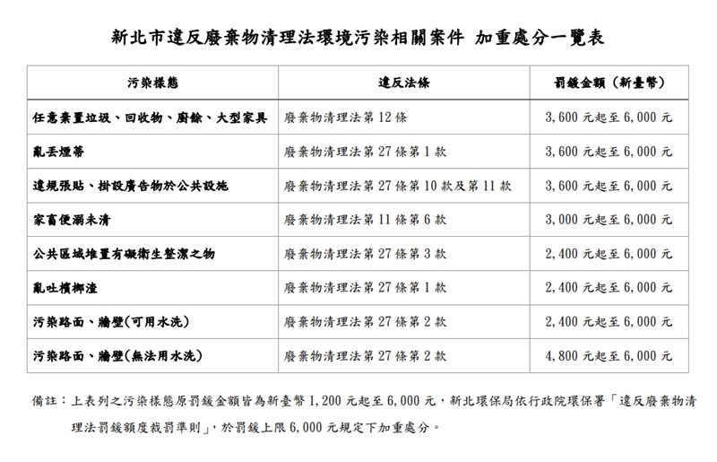 在加重處分的行為中,「任意棄置垃圾及家具」、「亂丟煙蒂」及「違規張貼廣告物於公共設施」罰鍰皆提高至新台幣3600元。