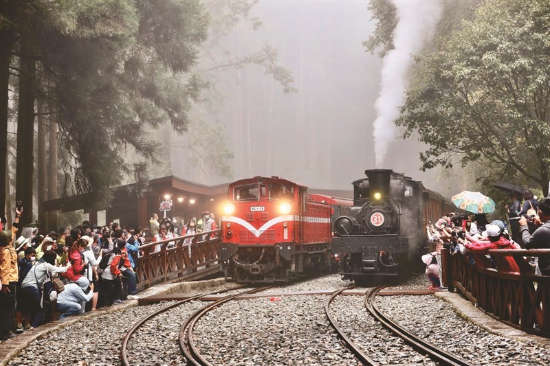 阿里山神木車站昨日重新啟用,並恢復過去的雙軌,林鐵處安排蒸汽火車(右)與柴油火車(左)同框鳴笛。圖/阿里山林業鐵路及文化資產管理處提供