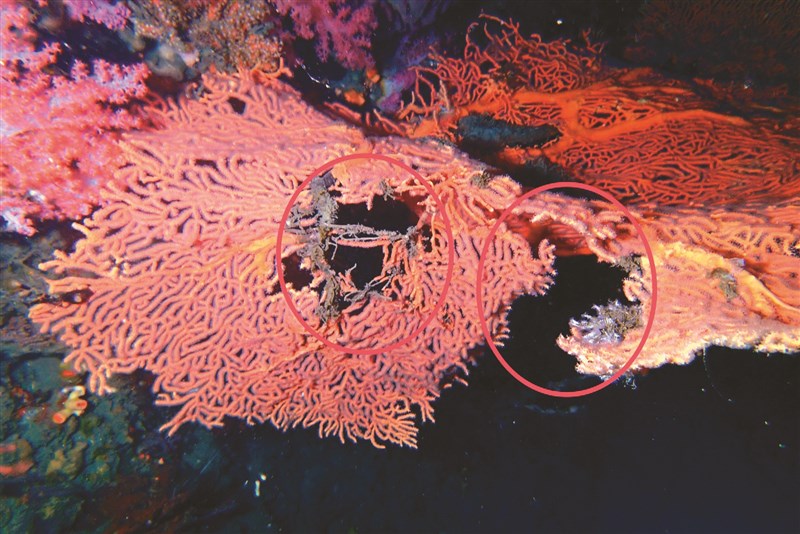 潮境保育區的大海扇珊瑚,出現破洞及斷枝(圈起處),疑遭人為破壞。圖/海科館提供
