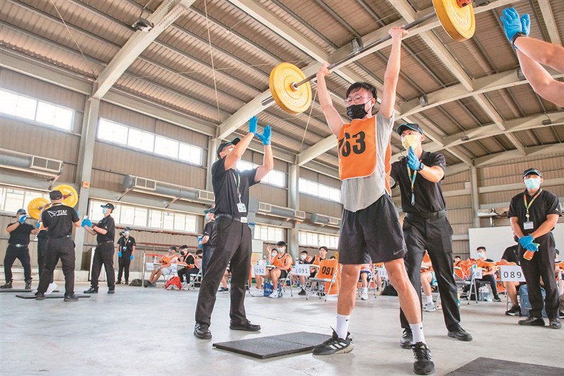 桃機昨天招考消防員,舉重是體能測驗的其中一項。圖/季相儒