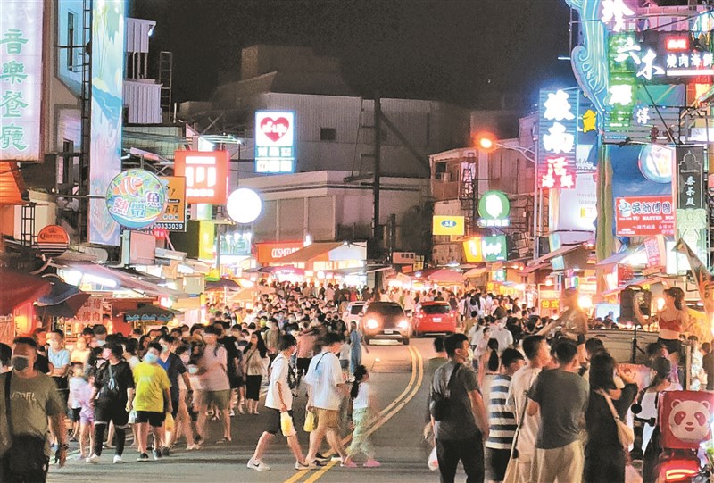 疫情趨緩加上國旅補助拉抬,屏東墾丁旅宿本周日起至下月的平日訂房從六成升至八成,假日也近滿房,各遊憩沙灘湧現戲水人潮,墾丁大街入夜後滿是遊客(圖)。圖/潘欣中