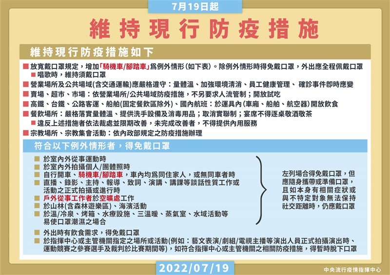 王必勝上任第一槍 騎車、戶外散步可脫罩 |2022.07.19 語音朗讀 1812觀看次 字級 大 中 小 騎車即起放寬戴口罩規定。圖╱中央社 【本報台北訊】疫情指揮中心新任指揮官王必勝表示,未來的防疫方向,將朝穩健開放、讓民眾恢復正常生活為目標。王必勝今天(19日)就送上任後第一個鬆綁政策,宣布即起騎機車、腳踏車、戶外空曠處工作者不需要戴口罩。外界好奇為何不同步開放戶外散步,王必勝表示,散步也是一種運動,可免戴口罩。王必勝表示,考量國內疫情趨緩,為兼顧防疫、經濟及社會運作,維持國內防疫量能與有效控管風險,經綜合評估疫情情勢,7月19日起適度放寬戴口罩等防疫措施,其中放寬「騎機車╱腳踏車」及戶外從事工作者於空曠處工作得免戴口罩。有記者提問,今天新增的免戴口罩例外狀況有空曠處工作,若只是在戶外從事散步休閒活動,是否也符合免戴口罩條件,王必勝表示,散步也是運動的一種,戶外從事運動本來在原先的免戴口罩條件中,散步可以不用戴口罩。至於為何不直接放寬為戶外都不用戴口罩,王必勝解釋,評估戶外開放不用戴口罩,主要需要具備「在空曠處」及「可與不特定人士保持社交距離」,未來會一階段、一階段逐步開放,只要風險可控,就會繼續開放。相關規定說明如下:一、放寬戴口罩規定,增加「騎機車╱腳踏車」為例外情形,例外情形時得免戴口罩,但外出時仍應全程佩戴口罩:(一)唱歌時,維持須戴口罩。(二)下列場合得免戴口罩,但應隨身攜帶或準備口罩,如本身有相關症狀或與不特定對象無法保持社交距離時,仍應戴口罩:1.室內外從事運動。2.室內外拍攝個人╱團體照。3.自行開車、騎機車╱腳踏車,車內均為同住家人,或無同車者時。4.直播、錄影、主持、報導、致詞、演講、講課等談話性質工作或活動之正式拍攝或進行時。5.戶外從事工作者於空曠處工作。6.於山林(含森林遊樂區)、海濱活動。7.於溫╱冷泉、烤箱、水療設施、三溫暖、蒸氣室、水域活動等易使口罩潮溼之場合。圖/指揮中心提供(三)外出時有飲食需求,得免戴口罩。(四)於指揮中心或主管機關指定之場所或活動(例如:藝文表演╱劇組╱電視主播等演出人員正式拍攝演出時、運動競賽之參賽選手及裁判於比賽期間等),如符合指揮中心或主管機關之相關防疫措施,得暫時脫下口罩。二、營業場所及公共場域(含交通運輸):應嚴格遵守量體溫、加強環境清消、員工健康管理、確診事件即時應變。三、賣場、超市、市場:依營業場所╱公共場域防疫措施,不另要求人流管制;開放試吃。四、高鐵、臺鐵、公路客運、船舶(固定餐飲區除外)、國內航班等交通運輸:於運具內(車廂、船舶、航空器)開放飲食。五、餐飲場所:應嚴格落實量體溫、提供洗手設備及消毒用品;宴席不得逐桌敬酒敬茶。違反上述措施者依法裁處並限期改善,未完成改善者,不得提供內用服務。六、宗教場所、宗教集會活動:依內政部規定防疫措施辦理。 前一篇文章 高中免試入學錄取率99.26%刷新高 956人落榜 下一篇文章 7月25日起 6類外籍人士可來台 熱門新聞 01南投太極美地空中纜車 下半年動工2026.03.2202鑲嵌藝術2026.03.2303【詩】白花鬼2026.03.2504【轉角風景】幽靜觀賞 三色寒櫻2026.03.2205故宮特展神獸再現 麒麟、鳳凰登場 2026.03.2406星雲大師靈骨分燈北美 法脈永傳2026.03.2407中南部水庫水位告急 各地農損頻傳2026.03.2408人間佛教聯合總會訪越南 弘法新契機2026.03.2309沉浸式共織宇宙 在新北美術館2026.03.2310蔣萬安感謝台北道場 共創城市亮點2026.03.23 訂閱電子報 台北市 天氣預報 台灣一週天氣預報 相關報導 京華城案 柯文哲重判17年台東實彈操演 美技術人員在場非核轉彎 卓:反核非神主牌李貞秀與2白委聯合質詢 邱垂正間接備詢汽油漲1.8元 卓揆:政府吸收13.2元盧秀燕出訪 藍:有助化解疑美論